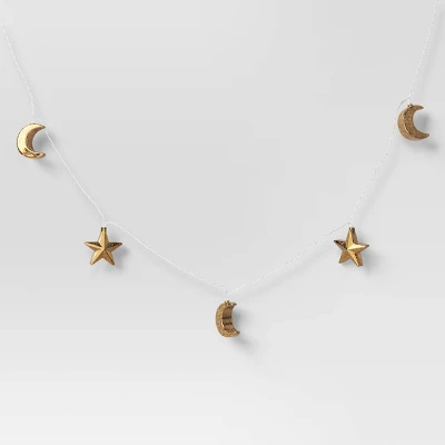 Infuse celestial shine into your decor with these LED Alternating Gold Star and Crescent Moon Lights Christmas White Light Bulb Color from Wondershop™. Powered by two AA alkaline batteries, this string of lights features a clear wire adorned with gold-color stars and crescent moons that are fitted warm white LED bulbs. Great for both indoor and outdoor use, you can spruce up your living or dining room, brighten your outdoor spaces, or highlight your seasonal decorations by draping these lights along walls, trees, shelves or door arches.