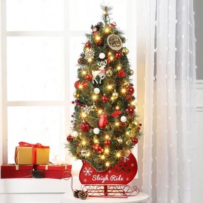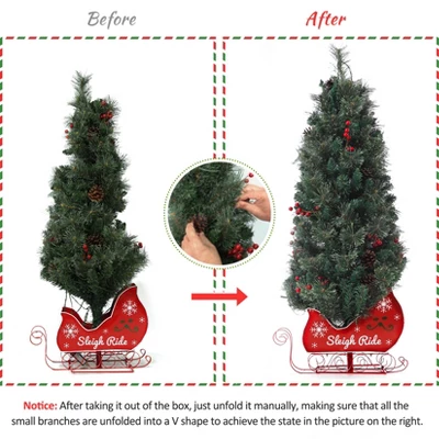 - 🎄【Lifelike Base 】 Compared with traditional metal tripods, our 4.5ft artificial tree is made of cement, with the tree sitting in an attractive lightbox that doesn’t expose the cement, Sleigh Base is not only stable and does not shake, providing a strong balance for the xmas tree.and this Xmas tree can have both indoor and outdoor use, standing out in the bedrooms or shops as a secure addition to any holiday setting.It is a pre-lit tree with no decoration on it except for branch tips and lights