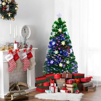 This is our 4ft Christmas tree, which is perfect for adding a holiday joy to your home or office. It is decorated with 18 Multi-Colored LED Lights,snowflakes and top star that will create a warm and romantic atmosphere. The most outstanding feature of our Christmas tree is many luminescent optical fiber leaves, Making it even more dazzling.And dense PVC needles appears fresh-cut. The included metal base is sturdy and holds the tree up well. 2-piece design make it very easy to assemble .