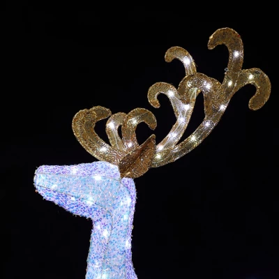 Add festive sparkle to your holiday scene with this enchanting 2-piece Reindeer and Sleigh Set, designed to add a touch of festive magic to any scene. Towering at an impressive 51.18 inches, this stunning duo is illuminated by 240 cool white LED lights, creating a captivating glow that will dazzle both indoor and outdoor spaces. Adorned with elegant silver bows and a shimmering finish, this set brings a charming allure from day into night, making it the perfect centerpiece for your Christmas celebrations.