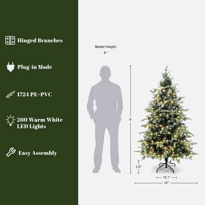 Ready to sleigh the season? This magnificent 6-foot frosted Christmas tree captures the essence of winter with its beautifully snow-kissed tips, charming frosted pinecones, and vibrant pops of red berries, creating a stunning festive centerpiece. With an impressive 1,724 lush tips and 260 twinkling warm lights, this exquisite artificial tree is designed for quick setup thanks to its convenient hinged branches. Whether you’re hosting lively parties, enjoying cozy movie nights, or simply savoring a cup of cocoa, this tree will elevate your living room into a winter wonderland!.