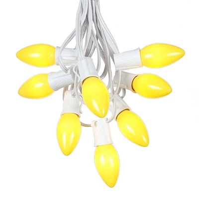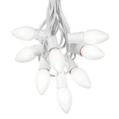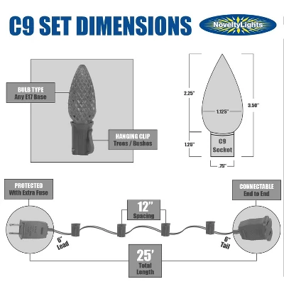 Novelty Lights C9 ceramic string light set with 25 bulbs is perfect for outdoor patios, decks, special event or Christmas lighting. Each set includes 25 long life C9 bulbs on a white wire stringer with 25 sockets that are spaced 12″ apart. These durable vintage filament clear ceramic c9 light strings have long lasting 3,000 hour bulbs and are on a 20 gauge SPT-1 white wire. All our c9 light strings use high quality materials that will stand up to all weathering. These C9 ceramic string light sets are great for putting on a roofline, decorating and indoor/outdoor tree, restaurant lighting, wedding events, and much more.