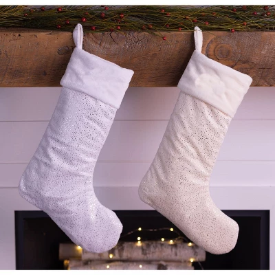 Celebrate the season with a touch of sparkle and softness. This White Christmas Stocking by MerryStockings features a plush white cuff and silver glitter-speckled body, offering a bright, wintry accent for your holiday mantel. Its snowy aesthetic blends beautifully with neutral, metallic, or modern holiday decor.Each stocking is carefully sewn in Minnesota for quality you can count on. While this stocking does not include personalization, the soft white cuff is perfect for adding a name locally—making it a thoughtful and customizable keepsake.